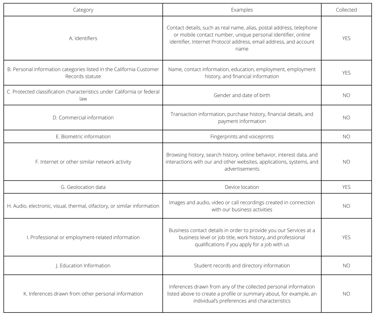 We may also collect other personal information outside of these categories through instances where you interact with us in person, online, or by phone or mail in the context of: